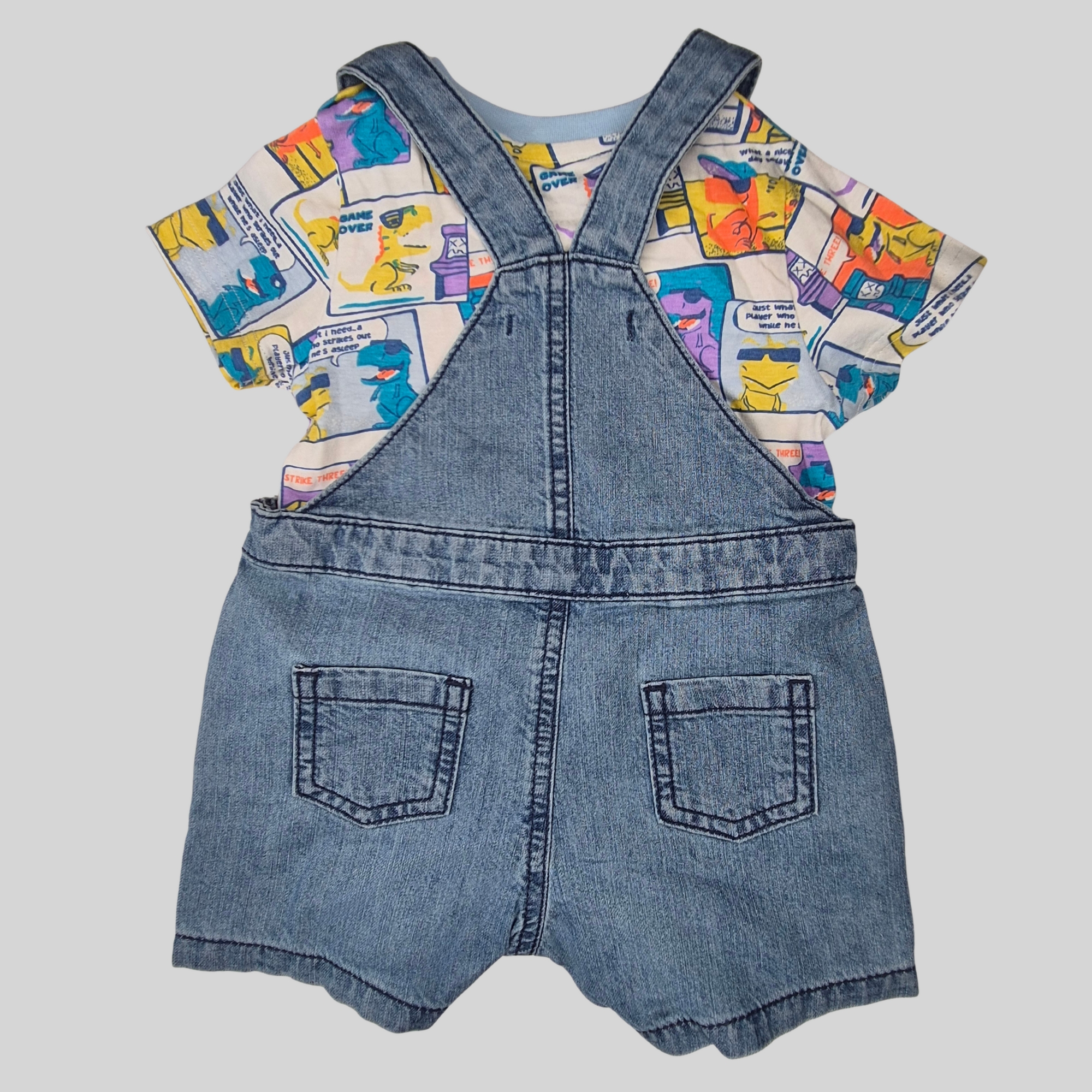 A playful and comfy girls’ outfit featuring denim dungaree paired with a colorful cartoon print inner t-shirt.